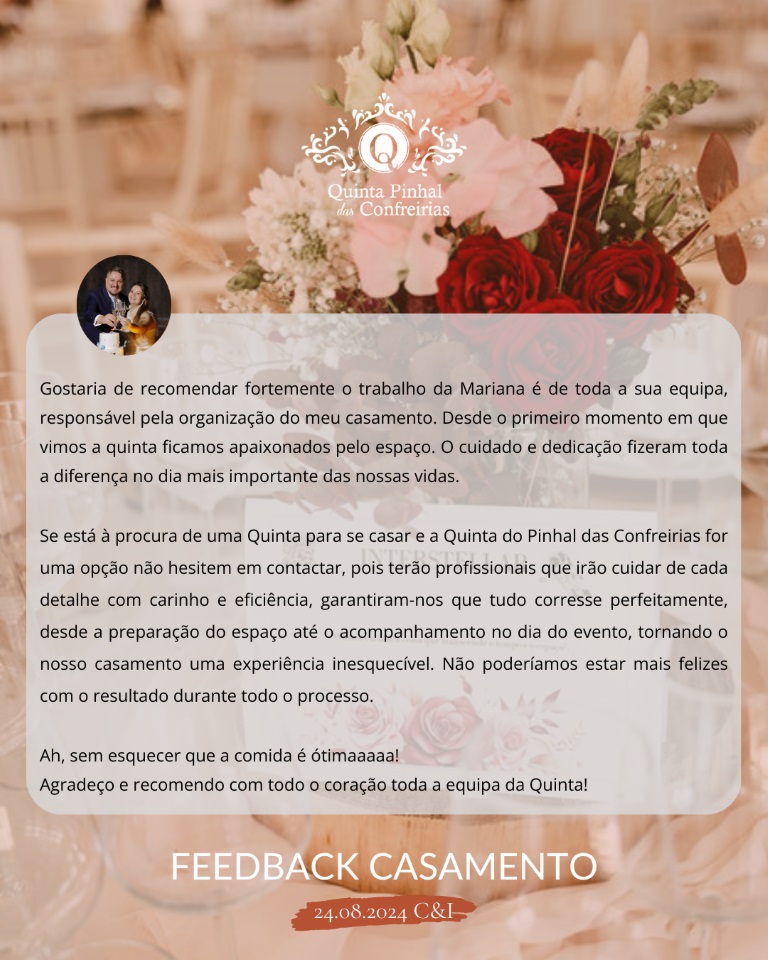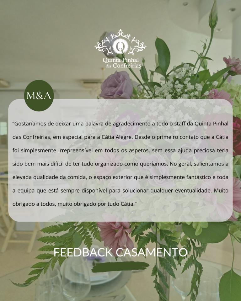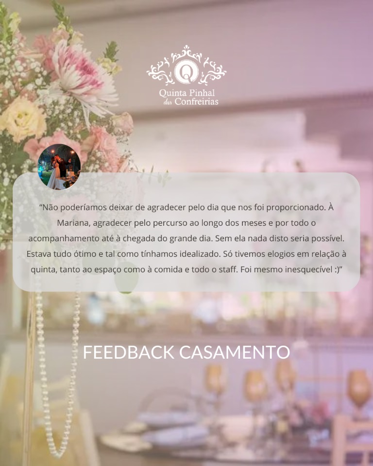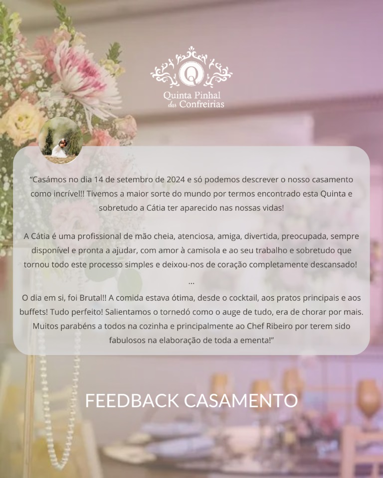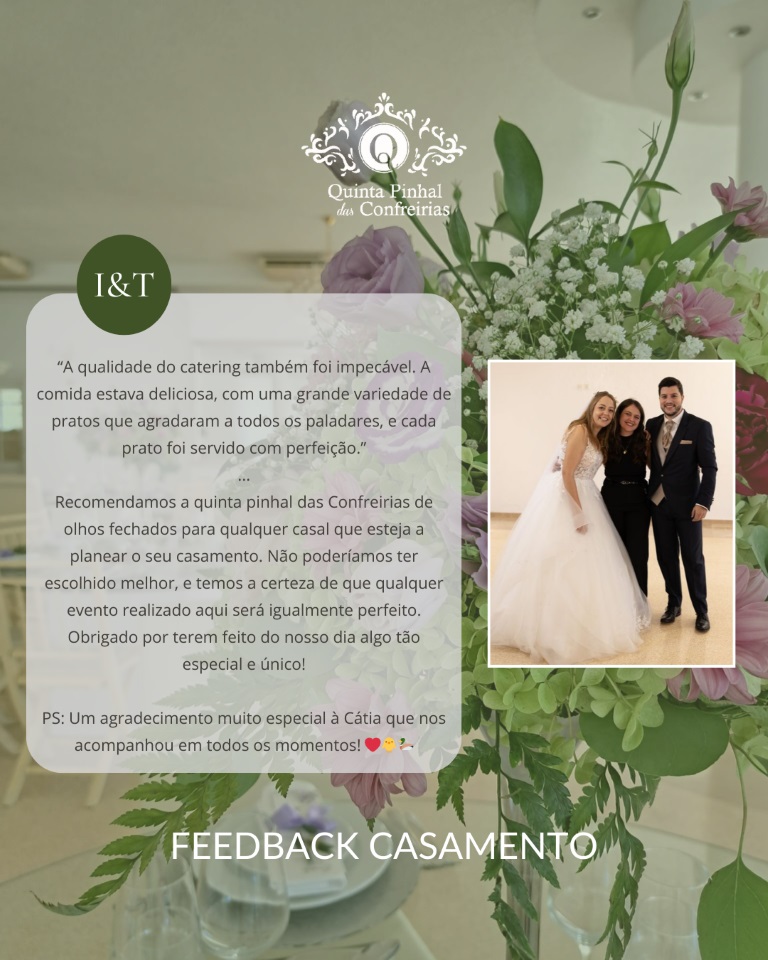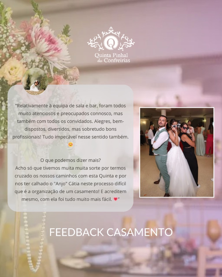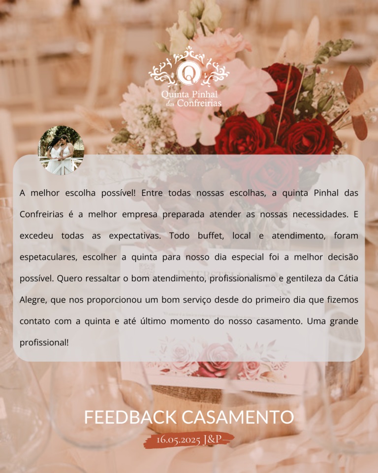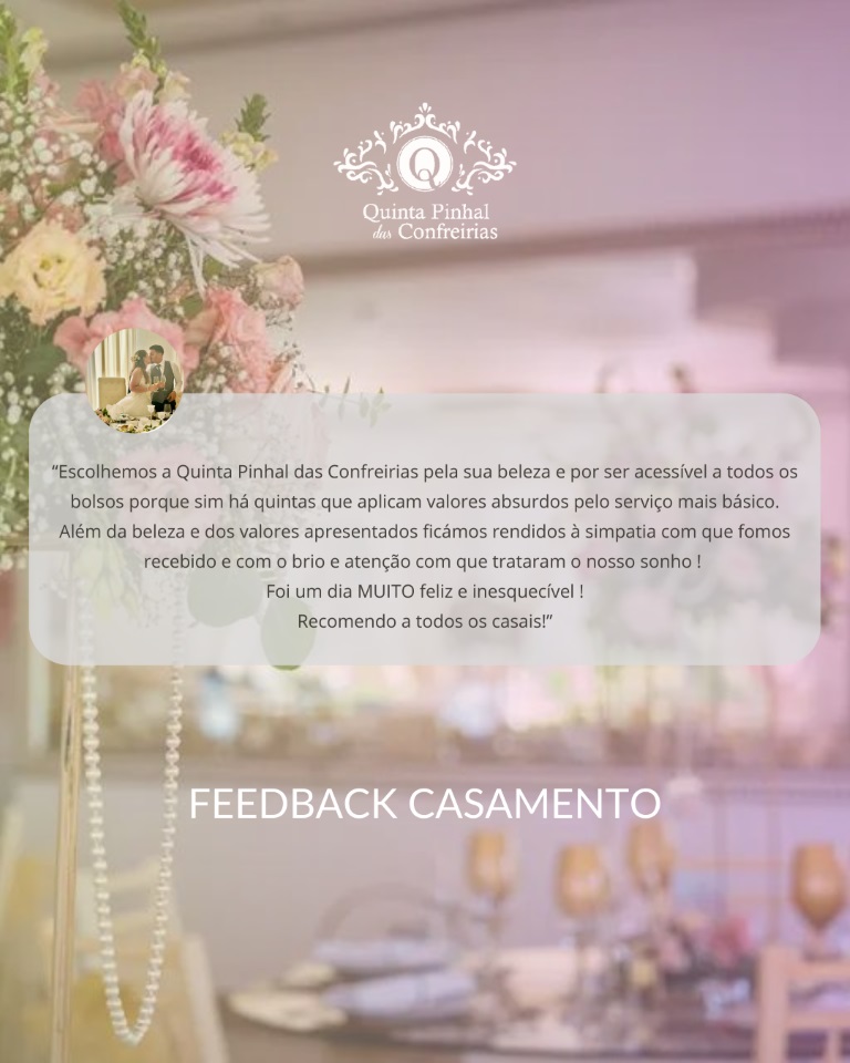 A Quinta Pinhal das Confreirias é uma magnífica e imponente Quinta, com uma vista deslumbrante sobre a Serra de Sintra e o Oceano Atlântico. Foi construída e planeada de raiz para a realização de Eventos, tendo sido projetada com todos os pormenores e infra-estruturas, para que os seus convidados se sintam bem e confortáveis e o dia seja único e inesquecível.